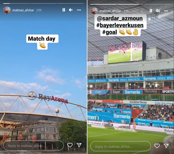 مهناز افشار عکسی از خود را در ورزشگاه بای‌آرنا در اینستاگرام به اشتراک گذاشت. او به تماشای بازی خانگی بایر لورکوزن با اینتراخت فرانکفورت نشسته بود.